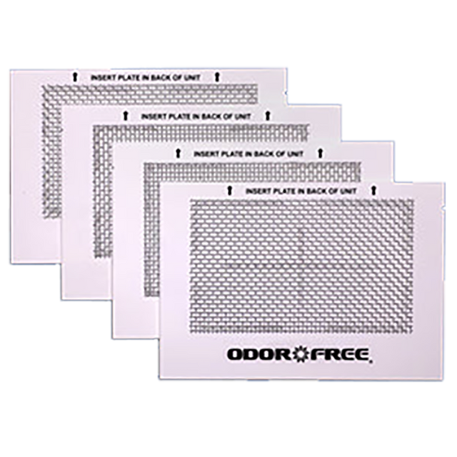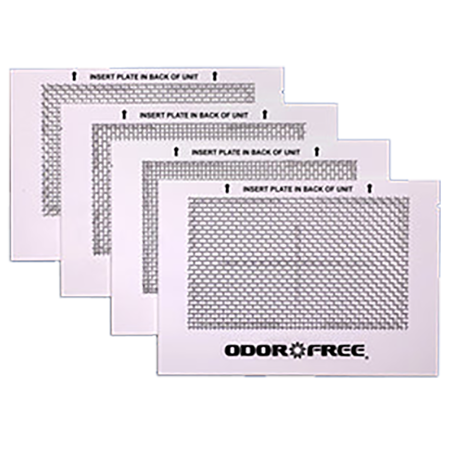 Cleaning the plates is quick and easy. Remove the plates from the back of the Odor Free, treat with a strong detergent, vinegar or bleach, scrub with a brush, and rinse thoroughly with hot water. Allow time for the plates to dry, or use a hairdryer, before re-inserting.