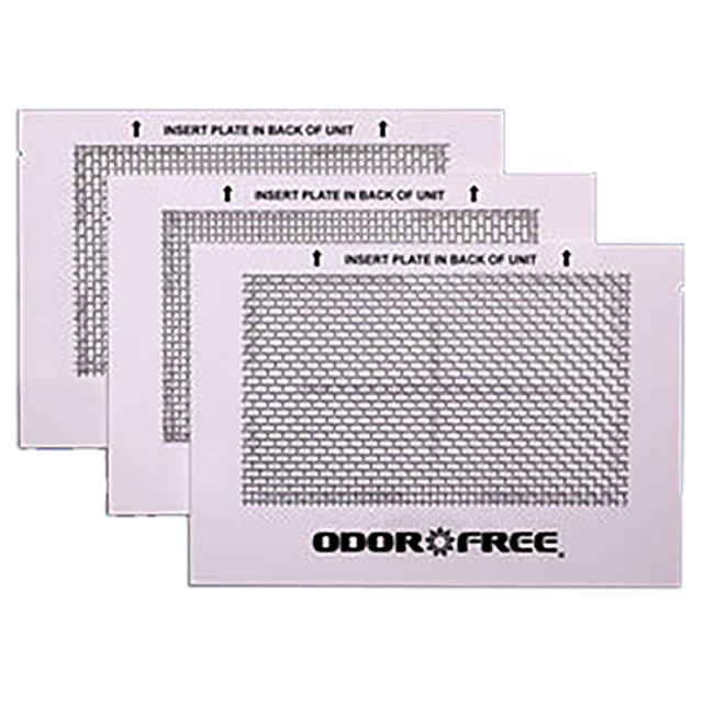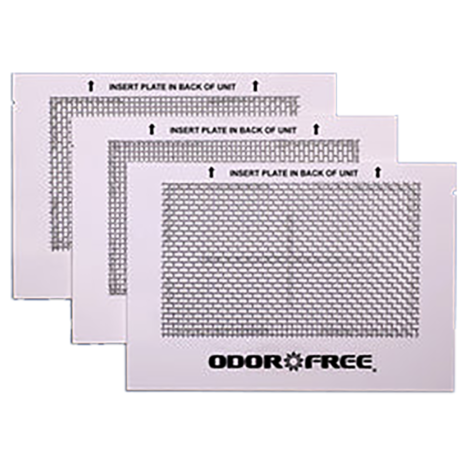Cleaning the plates is quick and easy. Remove the plates from the back of the Odor Free, treat with a strong detergent, vinegar or bleach, scrub with a brush, and rinse thoroughly with hot water. Allow time for the plates to dry, or use a hairdryer, before re-inserting.