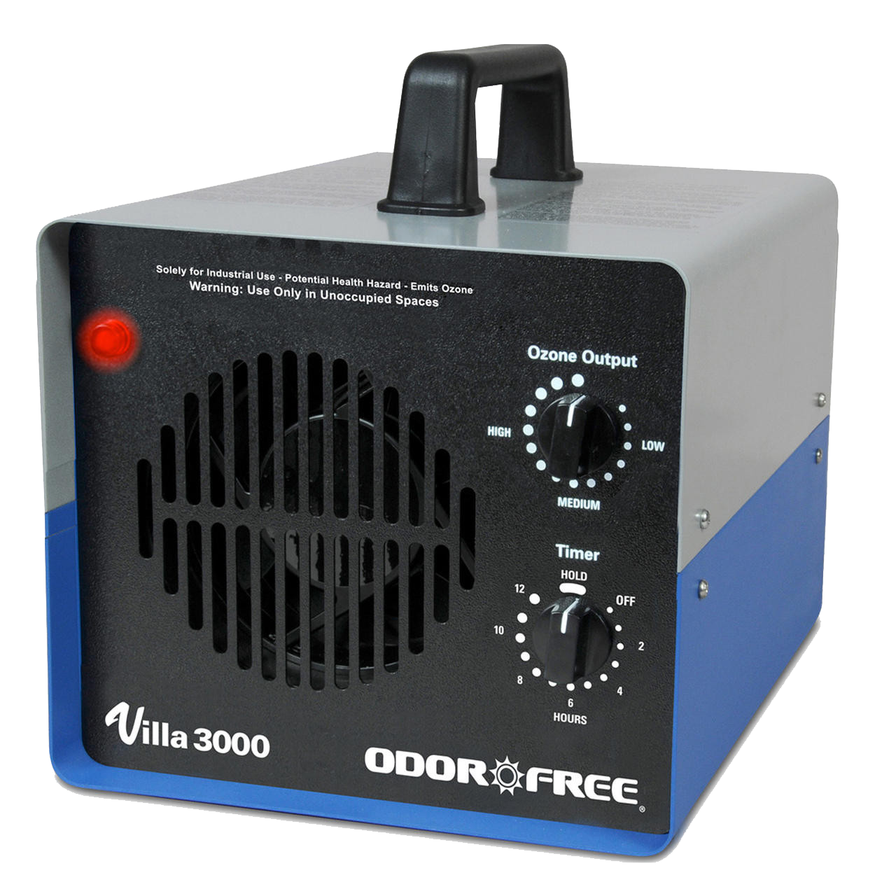 The Villa 3000 is designed for larger spaces such as homes, condos, and offices. This model has a variable ozone-output control and a 12-Hour Timer that turns off automatically when the treatment is completed. For deeply entrenched odors, there is also a “Hold” setting for treatment longer than 12 hours until the machine is turned off manually.